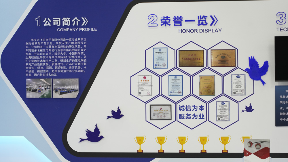 壽光市飛田電子有限公司是一家專業(yè)從事壓電陶瓷系列產(chǎn)品設(shè)計、研發(fā)及生產(chǎn)的高科技企業(yè)。公司擁有一支具有豐富經(jīng)驗(yàn)的研發(fā)隊伍,常年聘請多名在壓電陶瓷行業(yè)享有盛名的國內(nèi)知名專家,并與山東大學(xué)、清華大學(xué)、中國科學(xué)院、上海硅酸鹽研究所等單位保持良好合作關(guān)系。依托先進(jìn)的技術(shù)和生產(chǎn)工藝,研制生產(chǎn)的壓電陶瓷系列產(chǎn)品性能優(yōu)異,質(zhì)量穩(wěn)定。產(chǎn)品廣泛用于超聲清洗、焊接、探測、醫(yī)療B超、美容儀器、水聲換能、微型驅(qū)動、超聲波流量計等眾多領(lǐng)域。