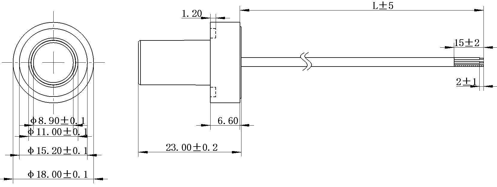 外殼材質(zhì) | 高分子材料 | 發(fā)射面尺寸 | φ10mm | 安裝面尺寸 | φ18×10×22.5mm |